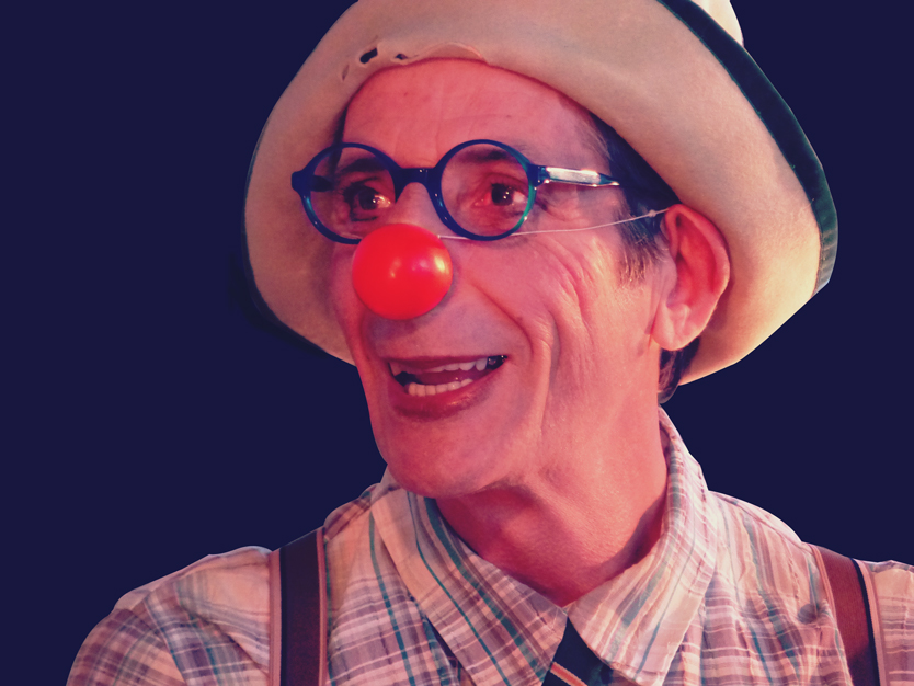 A theatre clown performance using French and English language, with options to alter the level of foreign vocabulary.