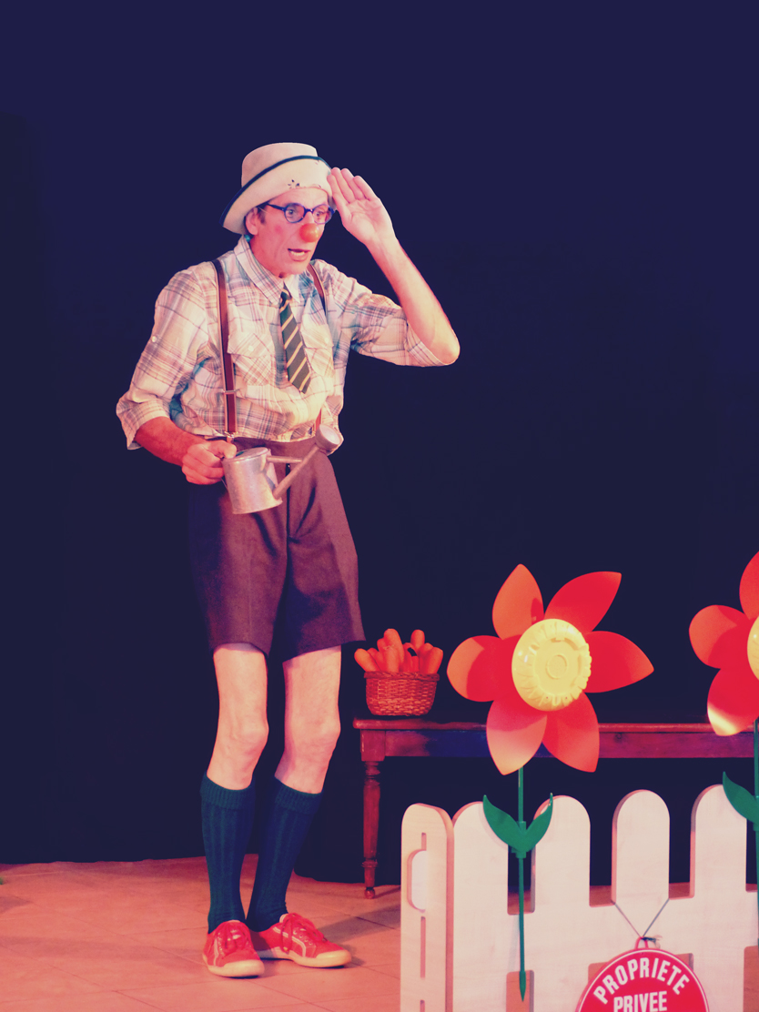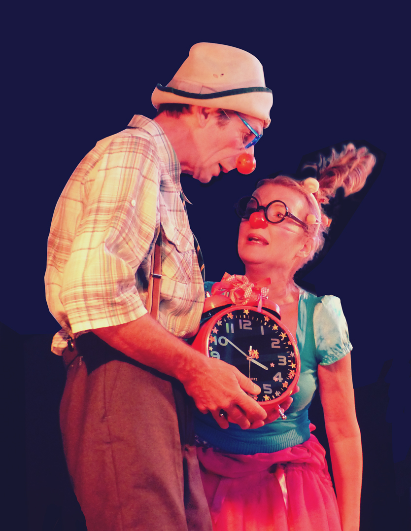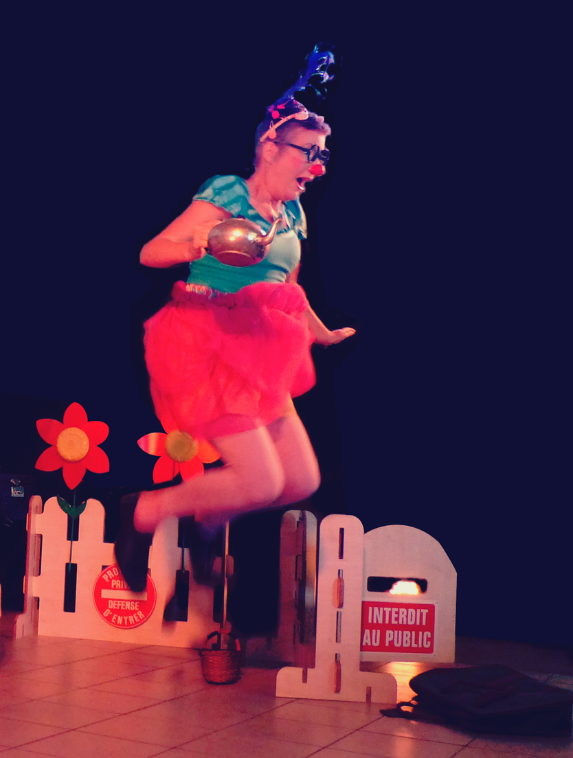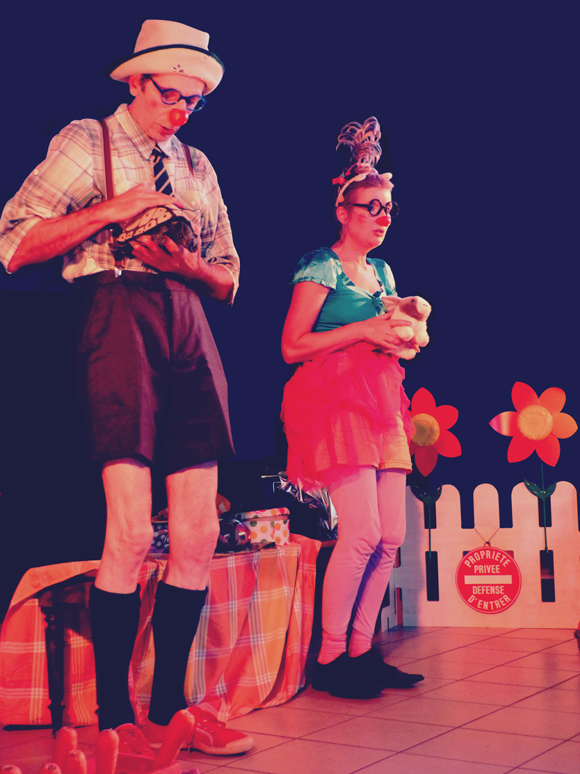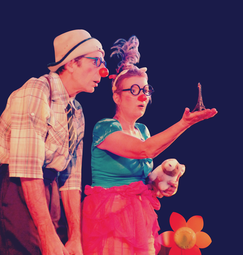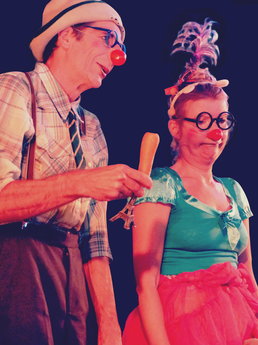 A theatre clown performance using French and English language, with options to alter the level of foreign vocabulary.