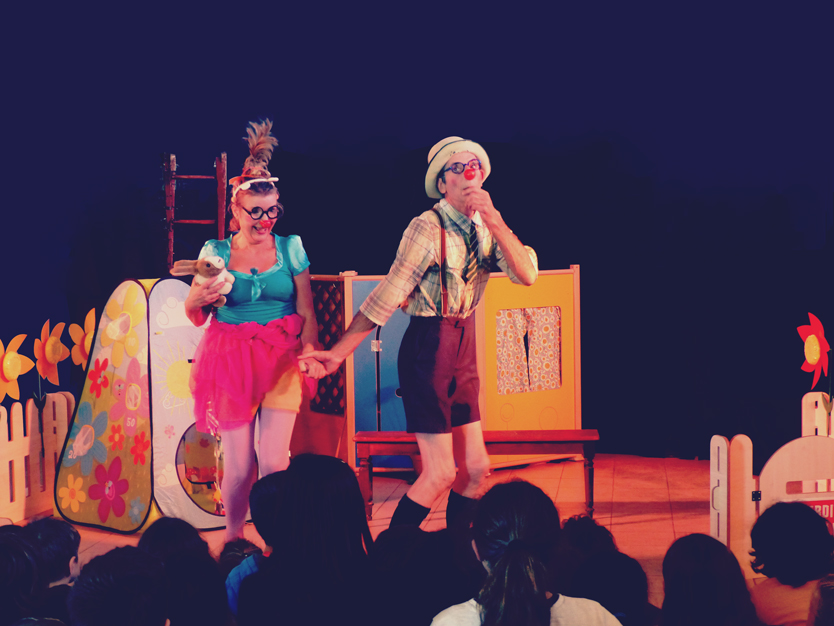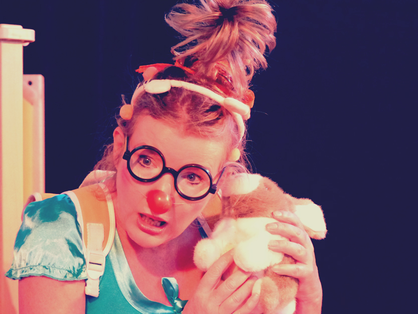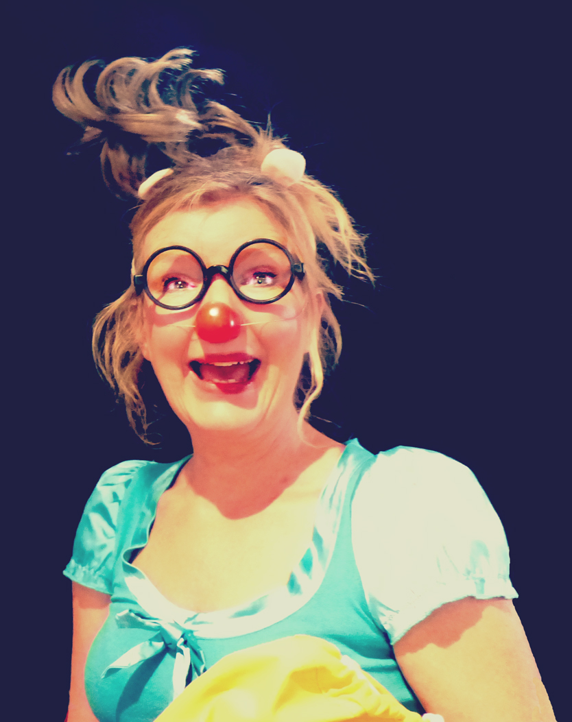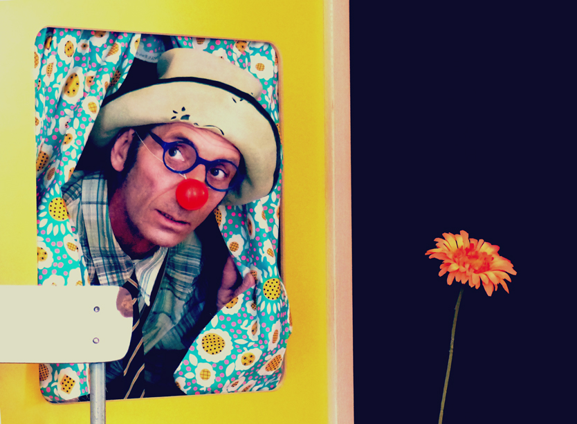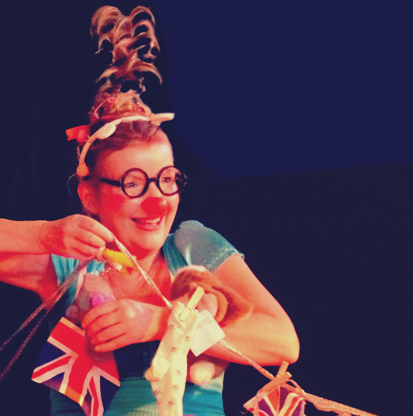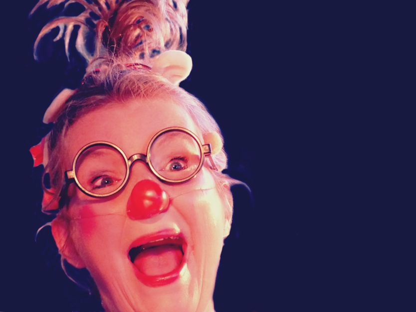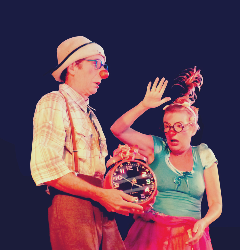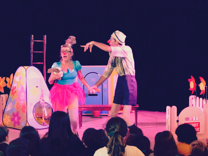 A theatre clown performance using French and English language, with options to alter the level of foreign vocabulary.